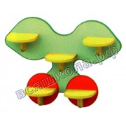 Подставки для цветов изготовлены в виде вишенок, они ярко красного цвета. Панель зелёного цвета напоминает по форме листочки. Любое растение на такой полке будет привлекать внимание, и украшать интерьер помещения.