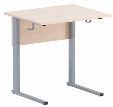 Стол ученический одноместный изготавливается на металлическом каркасе прямоугольного и квадратного сечения, окрашенном порошковой краской, стойкой к химическим и механическим воздействиям, на свободных концах труб установлены заглушки из ударопрочных полимеров. Столешница и передняя панель выполнены из ламинированной ДСП 16 мм, торцы столешницы облицованы кантом ПВХ 2 мм. Крепление металлической основы со столешницей осуществляется методом скрытого крепления, без выступающих на рабочей поверхности болтов. Имеется два крючка для портфелей. Каркас стола имеет полимерные подпятники, предотвращающие повреждение напольных покрытий.