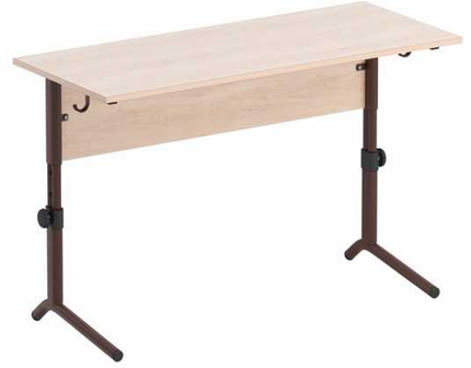 Позволяет регулировать высоту стола в зависимости от роста учащегося. Изготавливается на металлическом каркасе плоскоовального сечения, окрашенном порошковой краской, стойкой к химическим и механическим воздействиям, на свободных концах труб установлены заглушки из ударопрочных полимеров. Столешница и передняя панель выполнены из ламинированной ДСП 16 мм, торцы столешницы облицованы кантом ПВХ 2 мм. Крепление металлической основы со столешницей осуществляется методом скрытого крепления, без выступающих на рабочей поверхности болтов. Имеется два крючка для портфелей. Каркас стола имеет полимерные подпятники, предотвращающие повреждение напольных покрытий.