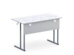 Стол ученический двухместный для кабинета физики изготавливается на металлическом каркасе прямоугольного сечения, окрашенном порошковой краской, стойкой к химическим и механическим воздействиям, на свободных концах труб установлены заглушки из ударопрочных полимеров. Столешница выполнена из ДСП 16 мм, облицована стойким к химическим воздействиям пластиком, торцы обрамлены кантом ПВХ 2 мм. Крепление металлической основы со столешницей осуществляется методом скрытого крепления, без выступающих на рабочей поверхности болтов. Стол комплектуется двумя электрическими розетками 36…42V, для электропроводки в каркасе предусмотрены отверстия. Имеется два крючка для портфелей. Каркас стола имеет полимерные подпятники, предотвращающие повреждение напольных покрытий.