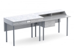 Стол демонстрационный изготавливается на металлическом каркасе круглого сечения Ø40 мм, рама - из трубы прямоугольного сечения. Каркас имеет сварную конструкцию с полимерным покрытием, стойким к химическим и механическим воздействиям, на свободных концах труб установлены заглушки из ударопрочных полимеров с резьбой под регулируемые опоры, которые находятся в комплекте и позволяют компенсировать неровности пола. Рабочая поверхность, передняя панель и два ящика, расположенные под рабочей поверхностью и имеющие правое и левое исполнение, выполнены из ламинированной ДСП 16 мм, столешница облицована стойким к химическим воздействиям пластиком, торцы обрамлены кантом ПВХ 2 мм. Стол демонстрационный комплектуется двумя электрическими розетками 36…42V, для электропроводки в каркасе предусмотрены отверстия.