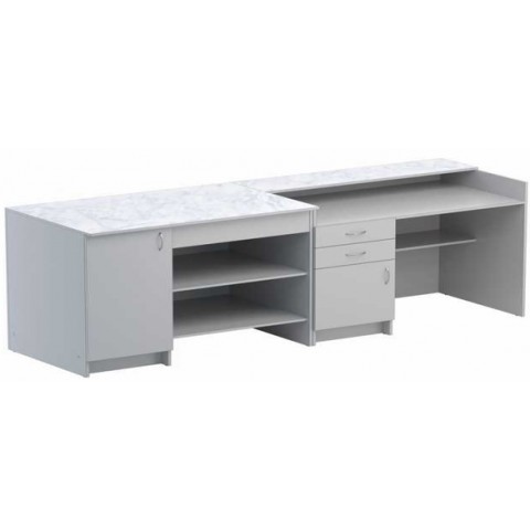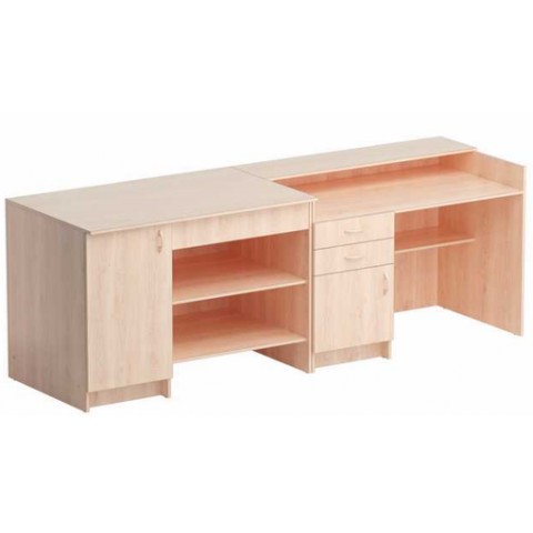 Стол демонстрационный приставной выполнен из ламинированной ДСП 16 мм, рабочая поверхность надстройки облицована стойким к химическим воздействиям пластиком, торцы обрамлены кантом ПВХ 2 мм. Стол демонстрационный имеет открытую полку, два ящика на роликовых направляющих, а также нишу, закрытую дверкой. Вертикальные стенки стола имеют полимерные подпятники, предотвращающие повреждение поверхности напольных покрытий.
