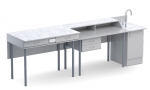 Изготавливается из ламинированной ДСП 16 мм,столешница облицована пластиком, стойким к химическим воздействиям, торцы обрамлены кантом ПВХ 2 мм. Тумба оборудована водоразборной колонкой и сливной раковиной.