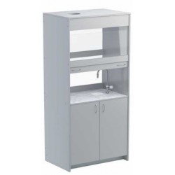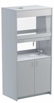 Изготавливается из ламинированной ДСП 16 мм, столешница облицована пластиком, стойким к химическим воздействиям, торцы обрамлены кантом ПВХ 2 мм. Шкаф вытяжной оборудован водоразборной колонкой и раковиной. В верхнем отделении шкафа предусмотрено отверстие под вытяжку.