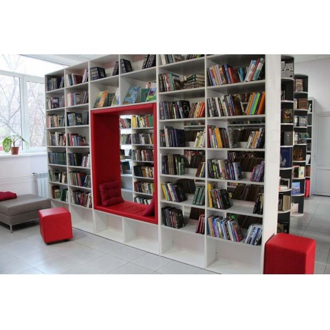 Идеальный стеллаж для обстановки современной библиотеки, книжного магазина, тайм-кофейни. Состоит из 3-х модулей - где два модуля представляют из себя полки из 8-ми ярусов и один модуль включает в себя встроенный диван. Диванчик с мягкими элементами позволяет посетителю расположиться со всем комфортом и удобством не отходя далеко от интересующей его книжной секции. Стеллаж смотрится современно, практично и оптимзирует пространство читального зала.