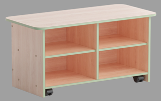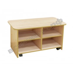 Тумба выполнена из ламинированной ДСП 16мм, края обрамлены кантом ПВХ 2 мм. Внутреннее пространство тумбы имеет четыре отделения. Размер отделений: высота – 204 мм, ширина – 376 мм, глубина – 334 мм. Углы крышки закруглены. Тумба установлена на колёсные опоры, которые видны только с внутренней стороны тумбы. Две опоры имеют тормоз для фиксирования тумбы.