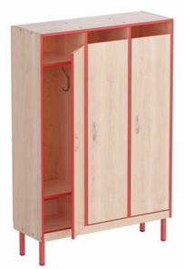 Выполнен из ламинированной ДСП 16 мм, края обрамлены кантом ПВХ 2 мм, задняя стенка изготовлена из ДВП 3,2 мм. В каждой секции имеются полки для головных уборов и обуви, а также 2 крючка для одежды.Каркас шкафа представляет собой цельносварную рамочную конструкцию, выполненную из стальной трубы прямоугольного сечения, окрашенную порошковой краской, стойкой к химическим и механическим воздействиям. На свободных концах труб установлены заглушки из ударопрочных полимеров. Предусмотрено крепление шкафа к стене.