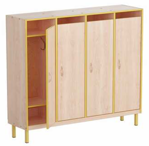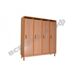 Выполнен из ламинированной ДСП 16 мм, края обрамлены кантом ПВХ 2 мм, задняя стенка изготавливается из ДВП 3,2 мм. В каждой секции имеются полки для головных уборов и обуви, а также 2 крючка для одежды. Каркас шкафа представляет собой цельносварную рамочную конструкцию, выполненную из стальной трубы прямоугольнго сечения, окрашенную порошковой краской, стойкой к химическим и механическим воздействиям. На свободных концах труб установлены заглушки из ударопрочных полимеров. Предусмотрено крепление шкафа к стене.