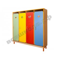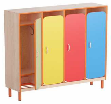 Выполнен из ламинированной ДСП 16 мм, края обрамлены кантом ПВХ 2 мм, задняя стенка изготавливается из ДВП 3,2 мм. В каждой секции имеются полки для головных уборов, 2 крючка для одежды и вентилируемая решетка для обуви. Каркас шкафа представляет собой цельносварную рамочную конструкцию, выполненную из стальной трубы прямоугольного сечения, окрашенную порошковой краской, стойкой к химическим и механическим воздействиям. На свободных концах труб установлены заглушки из ударопрочных полимеров. Предусмотрено крепление шкафа к стене.