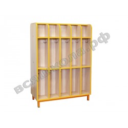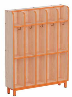 Выполнена из ламинированной ДСП 16 мм, края обрамлены кантом ПВХ 2 мм. Кант по желанию заказчика может быть: жёлтый, оранжевый, фисташковый, красный, синий. Вешалка имеет пять ячеек. В верхней части каждой ячейки установлена полочка для стаканов. Каждая ячейка разделена полкой на верхнюю часть (полотенце – лицо) и нижнюю часть (полотенце – ноги). В каждой части установлено по крючку для полотенец. В качестве опоры вешалка установлена на металлический каркас. Каркас представляет собой цельносварную рамочную конструкцию, выполненную из стальной трубы прямоугольного сечения, окрашенную порошковой краской, стойкой к химическим и механическим воздействиям. На свободных концах труб установлены заглушки из ударопрочных полимеров. Предусмотрено крепление вешалки к полу.