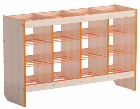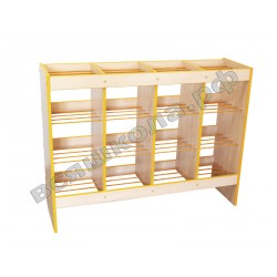 Выполнен из ламинированной ДСП 16 мм, края обрамлены кантом ПВХ 2 мм, полки вентилируемая решетка из металлического прутка, покрытая порошковой краской, стойкой к химическим и механическим воздействиям. Кант по желанию заказчика может быть: жёлтый, оранжевый, фисташковый, красный, синий. Металлический пруток в цвет канта. Предусмотрено крепление шкафа-стеллажа для горшков к стене. Вертикальные опоры имеют полимерные подпятники, предотвращающие повреждение напольных покрытий.