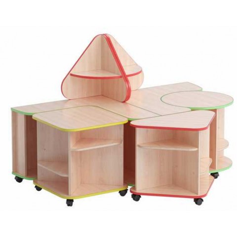 Выполнен из ламинированной ДСП 16 мм. Кромки щитовых элементов облицованы кромочным пластиком толщиной 2 мм. Набор мебели мобилен, удобен в использовании, а трансформируемость пространства дает возможность изменений предметно-пространственной среды в зависимости от образовательной ситуации. Возможно приобретение каждого из элементов набора по отдельности.