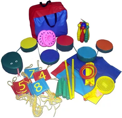 Состав и размеры: Сумка – 1 шт., ходунки – 1 пара, эстафетные палочки – 2шт, мячи d8см – 2шт, змейка-шагайка – 1 шт., мешок для прыжков- 2 шт., кегли, летающая тарелка- 2 шт., кольцеброс – 1 шт., бадминтон – 1 шт.,, городки – 1 шт.