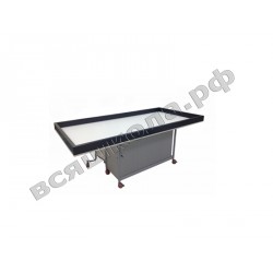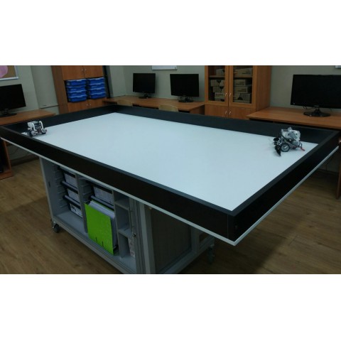 Представляет из себя полигон для роботов, на котором учащиеся смогут выполнять задания из учебных пособий. Рабочая поверхность расположена на удобной высоте и ограждена бортами со всех сторон. Размеры испытательной зоны (2460х1240 мм) позволяют разместить тренировочные поля для выполнения различных заданий. Также предусмотрена возможность хранения коробок с запиранием их на ключ. Конструкция системы позволяет изменять положение игровой поверхности – на вертикальное с фиксацией для транспортировки и хранения, на горизонтальное с фиксацией для проведения занятий. Для фиксации игровой поверхности в горизонтальном положении предусмотрены выдвижные ножки на колесах с их фиксацией в необходимом положении.