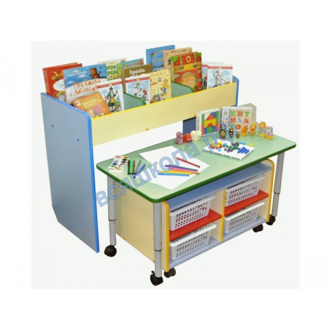 Многофункциональный компактный модуль для развивающей деятельности с тумбой-витриной для хранения книг и пособий, прямоугольным выкатным столом на рег.ножках и тумбой с корзинами на колесах.