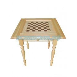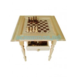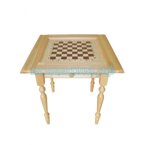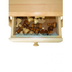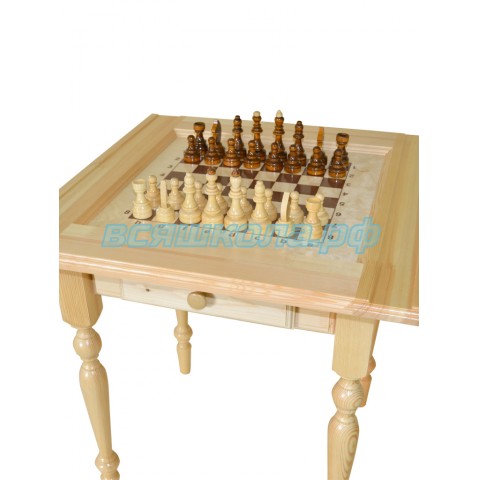 Крышка и ножки стола изготовлены из высококачественной древесины хвойных пород дерева. Игровое шахматное поле нанесено методом шелкографии на мебельную фанеру толщиной 10мм. Шахматные фигуры гроссмейстерские входят в комплект стола, размеры фигур: