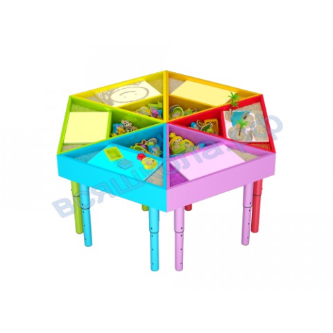 Столы имеют световой планшет для рисования песком, а так же, три отсека: Для песка, формочек и игрушек.