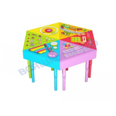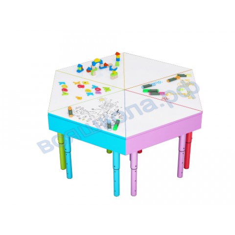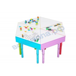 Детский комплекс состоит из отдельных приставных треугольных столиков, которые можно расставлять различными способами (кругом, рядами, парами, и д.р.) для того, чтобы задействовать, как можно больше вариантов групповой и индивидуальной работы, и подобрать тот, который по мнению педагога, будет больше соответствовать теме занятия.