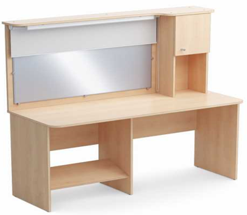 Стол логопеда имеет следующие габаритные размеры: ширина - 1400 мм, глубина - 584 мм, высота - 700 мм (столешница), - 1400 мм (высота с надстройкой).