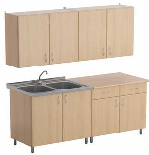 Выполнен из ламинированной ДСП 16 мм, кант ПВХ толщиной 0,25- 0,5 мм. Столы имеют регулируемые опоры высотой 100 мм. Шкафы навесные – навесы для крепления к стене. Возможно приобретение каждого из элементов гарнитура в отдельности.