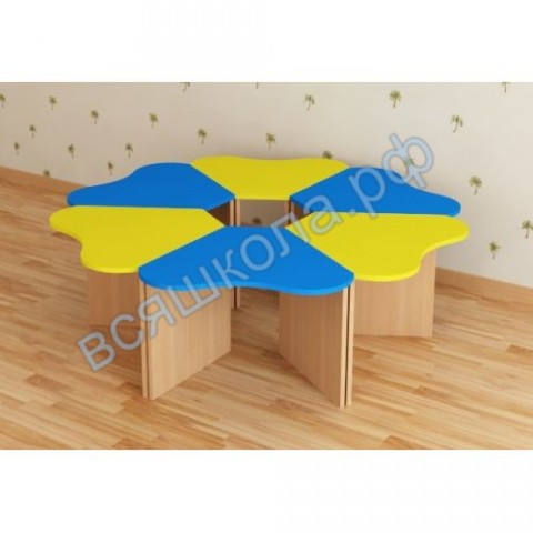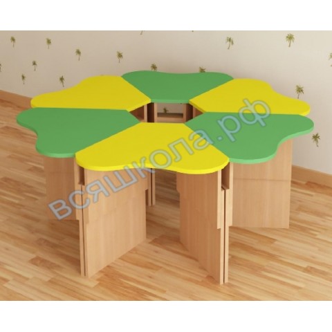 Яркий, оригинальный в дизайнерском исполнении стол детский «Ромашка» украсит уголок в Вашем детском саду. Мягкие, элегантные линии без углов делают этот предмет интерьера безопасным для ребенка. Стол состоит из 6 «лепестков-столешниц», выполненных из ЛДСП. Столешницы располагаются на ламинатных ножках, как регулируемых, так и нерегулируемых.