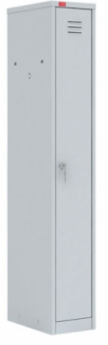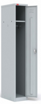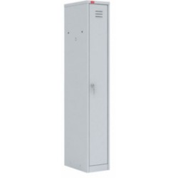 Шкаф разборный металлический односекционный, для хранения сменной одежды. В отделении: полка для головного убора, перекладина для вешалки и крючки для одежды, врезной замок. Шкаф может комплектоваться полкой для обуви (в комплект не входит). Полимерное порошковое покрытие светло-серого цвета (RAL 7035).