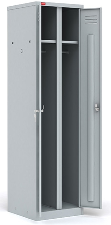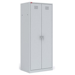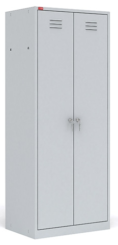 Шкаф металлический разборный двухсекционный, предназначен для хранения сменной одежды. В стандартную комплектацию каждой секции входят съемная полка для головного убора, перекладина для вешалки и крючки для одежды, врезной замок. Шкаф может комплектоваться полками для обуви и регулируемыми опорами (в комплект не входят). Полимерное порошковое покрытие светло-серого цвета(RAL 7035).
