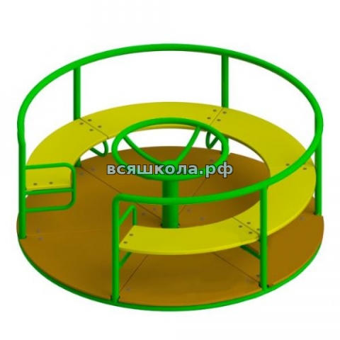 Дети будут счастливы гулять во дворе, если у них будет компактная карусель со сплошным сидением. Вращать карусель можно, крутя руль в центре конструкции, либо бегая вокруг изделия.