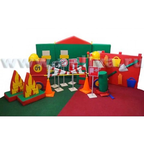 Полный комплект: Знаки – 6шт., Пожарный щит 1*0,8 – 1шт., Ворота: Подставка 2, конус 2, флажок 2., Каска с воротом – 4шт., Накидка - боевка – 4шт., Рукавицы-краги (пара) – 4шт., Пламя с опорой – 2шт., Машина пожарная 2*1*0,8 (Кабина машины 1, Задняя часть машины 1, Колесо машины 4, Катушка с тремя пожарными рукавами 1, Мигалка 2, Лестница (с двумя липучками) 1), Ширма-дом 2*1*0,15 – 1 шт.