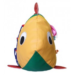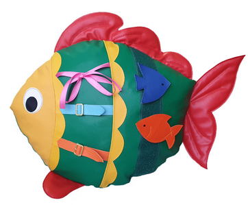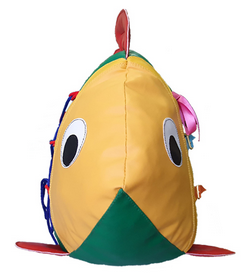 На спине рыбки расположены различные многофункциональные детали: шнуровка, застежки, липучки. У рыбки имеются плавники, хвостик и мордочка в виде аппликации.