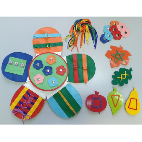 Представляет собой цветок, на который нанесены различные элементы для развития мелкой моторики и навыков самообслуживания. Дети учатся застегивать кнопки, пуговицы, пряжки, крючки, шнуровать, плести косички и завязывать банты.