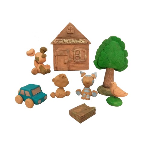 В набор входят восемь фигурок: малыш, дом, дерево, книга, собака, кошка, птичка, машина.