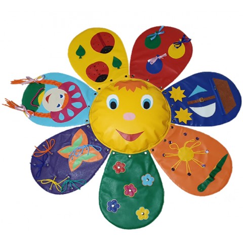 На каждом лепестке семицветика нанесены различные аппликации, игровые элементы, съемные фигуры способствующие развитию мелкой моторики, координации движений, навыков самообслуживания (шнуровки, пуговицы, бусинки, бантики, кнопки, липучки, молния и застежки).
