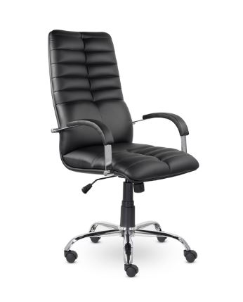 Современное кресло руководителя имеет вертикальную и горизонтальную прострочки, делящие спинку и сидение на небольшие прямоугольники. Тем самым создается интересный дизайн и кресло становится еще мягче. Подлокотники с мягкими накладками и крестовина выполнены из хрома.