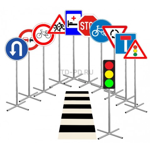 10 знаков , светофор , зебра. Размеры знака:250х250х1100мм Из металлической трубы 18 и 22мм , ПВХ Зебра: поролон,кожзам 1000х600мм Стойки разборные. Вес набора 15 кг Объём 0,05м/куб