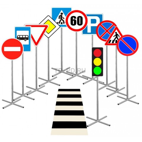 10 знаков , светофор , зебра. Размеры знака:250х250х1100мм Из металлической трубы 18 и 22мм , ПВХ Зебра: поролон,кожзам 1000х600мм Стойки разборные. Вес набора 15 кг Объём 0,05м/куб