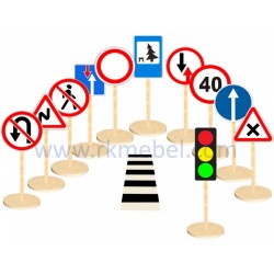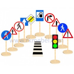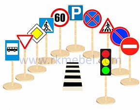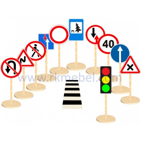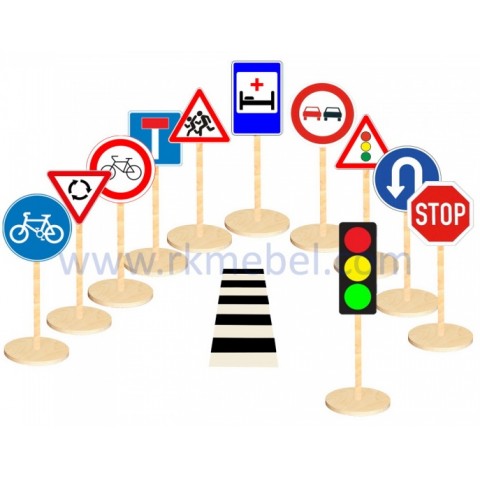 10 знаков , светофор , зебра. Диаметр знака 60мм; высота 200мм Из ПВХ - УФ Печать. Зебра: ПВХ - УФ Печать.200х100мм Стойки из массива и фанеры.