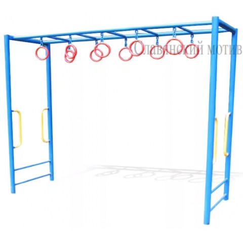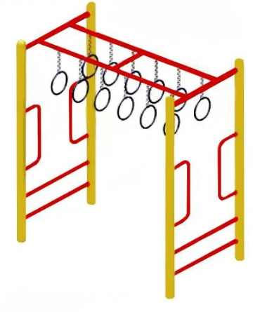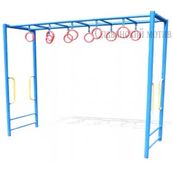 Рукоход изготавливается из металлической трубы Ø76 мм и Ø 33 мм, окрашенной полимерно-порошковой краской, устойчивой к воздействию неблагоприятных погодных условий и ультрафиолета. Кольца и цепь металл. Длина 2400 мм, ширина 1200 мм, высота 2500 мм, глубина бетонирования 700 мм.