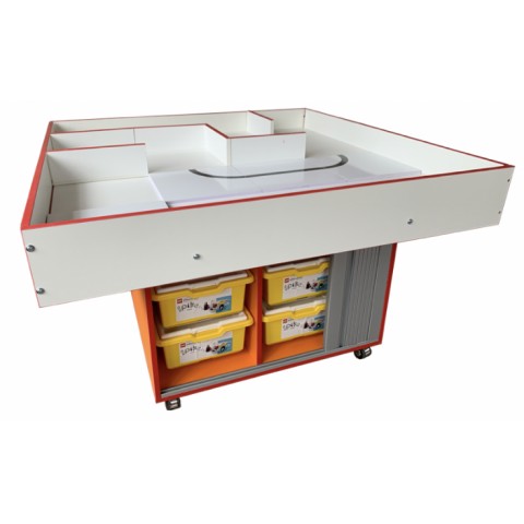 Столешница 120 х 120 см на мобильной тумбе на колесиках, закрывающейся пластиковой ролетой с замком. По сути - половина от Двойного стола. В комплекте дополнительные перегородки и модульные борта с возможностью изменения высоты (5 или 11 см). Размещается 8 коробок конструкторов (+ полочки для документов).