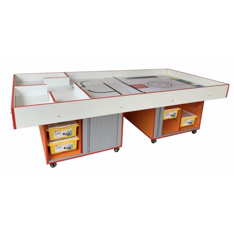 (Столешница из 2 частей 120 х 120 см и с двумя отдельными тумбами на колесиках, закрывающимися пластиковыми ролетами с замком. Возможно использование как отдельно в качестве двух независимых столов, так и совместно, получив стандартное поле 120 х 240 см. В комплекте дополнительные перегородки и борта с возможностью изменения высоты (5 или 11 см). Размещается 16 коробок конструкторов (+ полочки для документов).