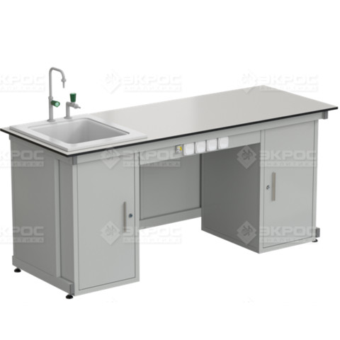 Стол демонстрационный для кабинета химии с защитным химостойким и термостойким покрытием, раковиной, подведением и отведением воды, сантехникой, эл.розетками и автоматами аварийного отключения тока