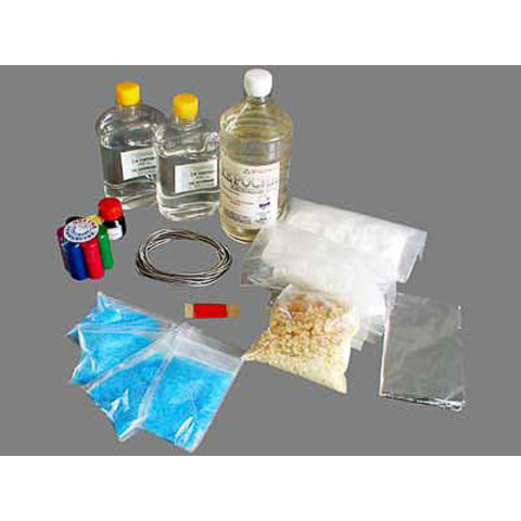 Комплектность: канифоль - 0,2 кг, керосин - 0,9 л, медный купорос - 0,2 кг, нить капроновая - 20 м, парафин - 0,2 кг, припой ПОС 60 - 0,2 кг, соль поваренная - 0,5 кг, марганцево-кислый калий - 0,02 кг, горючее для спиртовок - 0,33 л, фольга алюминиевая - 10 листов, пластилин - 0,17 кг.