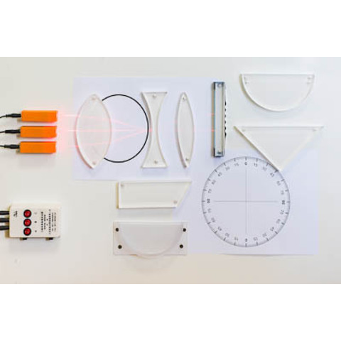 Комплектность: блок питания – 1 шт., батарейки (тип ААА) – 2 шт., лазерные источники света – 3 шт., провода – 3 шт., призма – 1 шт., плоскопараллельная пластина – 1 шт., линза плосковыпуклая – 1 шт., линзы собирающие (F = 120 мм, F = 200 мм) – 2 шт., линза рассеивающая (F = – 150 мм) – 1 шт., зеркало – 1 шт., кювета для воды – 1 шт., маркер – 1 шт., планшет с круговым транспортиром – 1 шт., схема глаза – 1 шт., магнитные кнопки – 4 шт., руководство по эксплуатации с методическими рекомендациями – 1 шт.