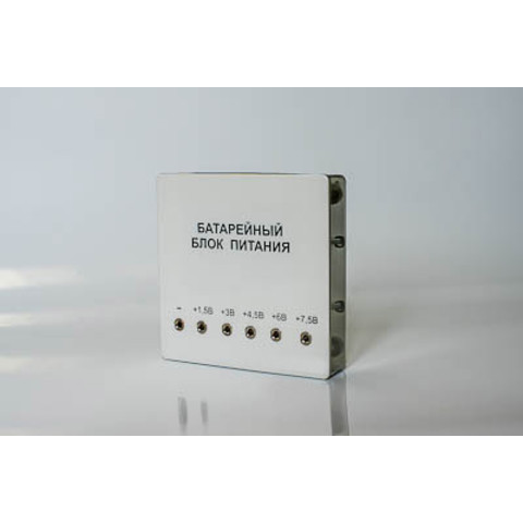 Источник питания представляет собой батарейный блок с возможностью регулирования выходного напряжения от 1,5 до 7,5 В с шагом в 1,5 В. Собран в пластмассовом корпусе. На крышке корпуса установлены гнезда для подключения нагрузки. Работает от 5 батареек на 1,5 В типа АА (в комплект не входят). Батарейки могут быть заменены на аккумуляторы с теми же параметрами.