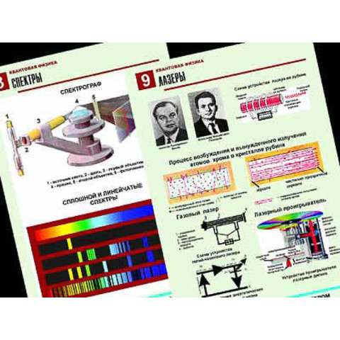 Комплект охватывает следующие темы: открытие электрона, фотоэффект, спектры, планетарная модель атома, модель атома водорода по Бору, опыты Франка и Герца, корпускулярно-волновой дуализм, соотношение неопределенностей, лазеры, частицы и античастицы.