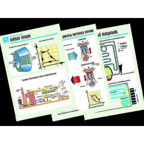 Комплект охватывает следующие темы: внутренняя энергия, работа газа, законы термодинамики, паровая машина Ползунова, паровая турбина, четырехтактный двигатель внутреннего сгорания, газотурбинный двигатель, компрессионный холодильник, ракетные двигатели, энергетика и энергетические ресурсы.