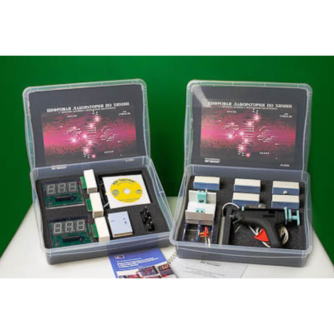 Комплектность: измерительные блоки – 2 шт., провода с USB-разъемом – 2 шт., провода с телефонными разъемами – 2 шт., адаптеры для включения в сеть (220 В, 50 Гц) – 2 шт., электронный носитель с программным обеспечением – 1 шт., датчик массы (включает: модуль «МАССА» – 1 шт., модуль «до 200 г» – 1 шт.) – 1 комплект, датчик температуры (модуль «ТЕМПЕРАТУРА –55…+125 ºС») – 1 шт., термопарный датчик температуры (модуль «ТЕМПЕРАТУРА +50…+1000 ºС») – 1 шт., датчик РH (включает: модуль «РH» – 1 шт., трубка-сенсор РН с проводом – 1 шт., набор реактивов для калибровки – 1 шт.) – 1 комплект, датчик электропроводности жидкости (модуль «ЭЛЕКТРОПРОВОДНОСТЬ») – 1 шт., датчик электрохимического потенциала (включает: модуль «ЭЛЕКТРОХИМИЧЕСКИЙ ПОТЕНЦИАЛ» – 1 шт., графитовые пластины – 2 шт., цинковая пластина – 1 шт., медная пластина – 1 шт., свинцовая пластина – 1 шт., прозрачная кювета – 1 шт., фиксатор с двумя электродами типа «крокодил» – 1 шт., соединительные провода – 2 шт.) – 1 комплект, датчик объёма жидкого реагента (модуль «ОБЪЁМ ЖИДКОГО РЕАГЕНТА») – 1 комплект, датчик оптической плотности (включает: модуль «ОПТИЧЕСКАЯ ПЛОТНОСТЬ» – 1 шт., прозрачная кювета с меткой – 1 шт.) – 1 комплект, учебное пособие «Демонстрационные опыты с цифровыми лабораториями. Физика. Химия» (авторы Е.Ю. Косарева, Л.Е. Богданова, печать офсетная, обложка полноцветная) – 1 шт., руководство по эксплуатации – 1 шт.