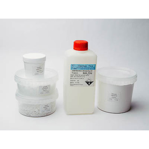 Набор химических реaктивов № 3 ОС Гидроксиды Состав набора (кг): Аммиак водный 25% - 0,45. Бария гидроксид - 0,05. Калия гидроксид - 0,2. Кальция гидроксид - 0,5. Натрия гидроксид - 0,5.