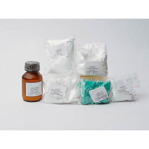 Набор химических реaктивов № 11 ОС Карбонаты Состав набора (кг): Аммония карбонат - 0,05. Калия карбонат - 0,05. Калия гидрокарбонат - 0,1. Меди (II) карбонат - 0,1. Натрия карбонат - 0,1. Натрия гидрокарбонат - 0,1.