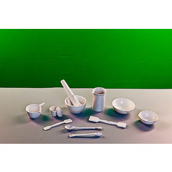 Комплектность: кастрюля с ручкой №1 – 1 шт., ложка №1 – 1 шт., ложка №2 – 1 шт., пест №3 – 1 шт., стакан №3 – 1 шт., Ступка №3 – 1 шт., тигель №3 – 1 шт., крышка к тиглю №3 – 1 шт., чашка выпарительная №2 – 1 шт., чашка выпарительная №3 – 1 шт., шпатель № 1 – 1 шт., шпатель № 2 – 1 шт. Изготовлены из фарфора.